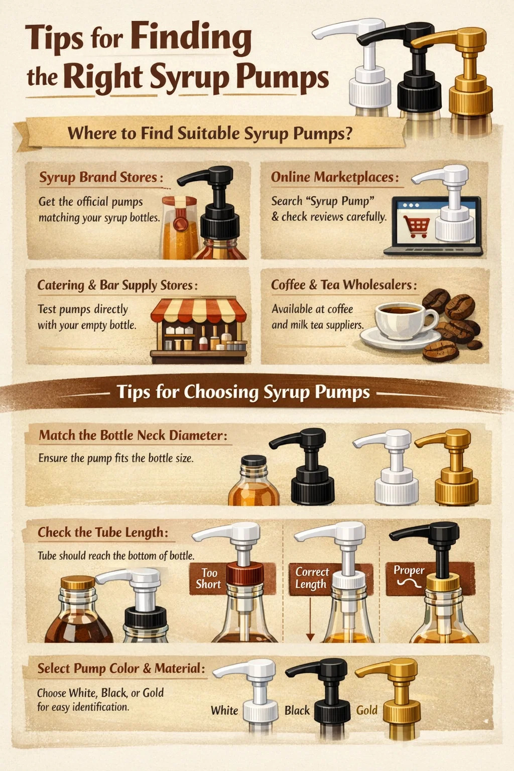 Dacă sunteți în căutarea pompelor de sirop potrivite, dar vă faceți griji că nu obțineți o dimensiune greșită, iată câteva sfaturi pentru a le găsi și metode obișnuite de cumpărare: