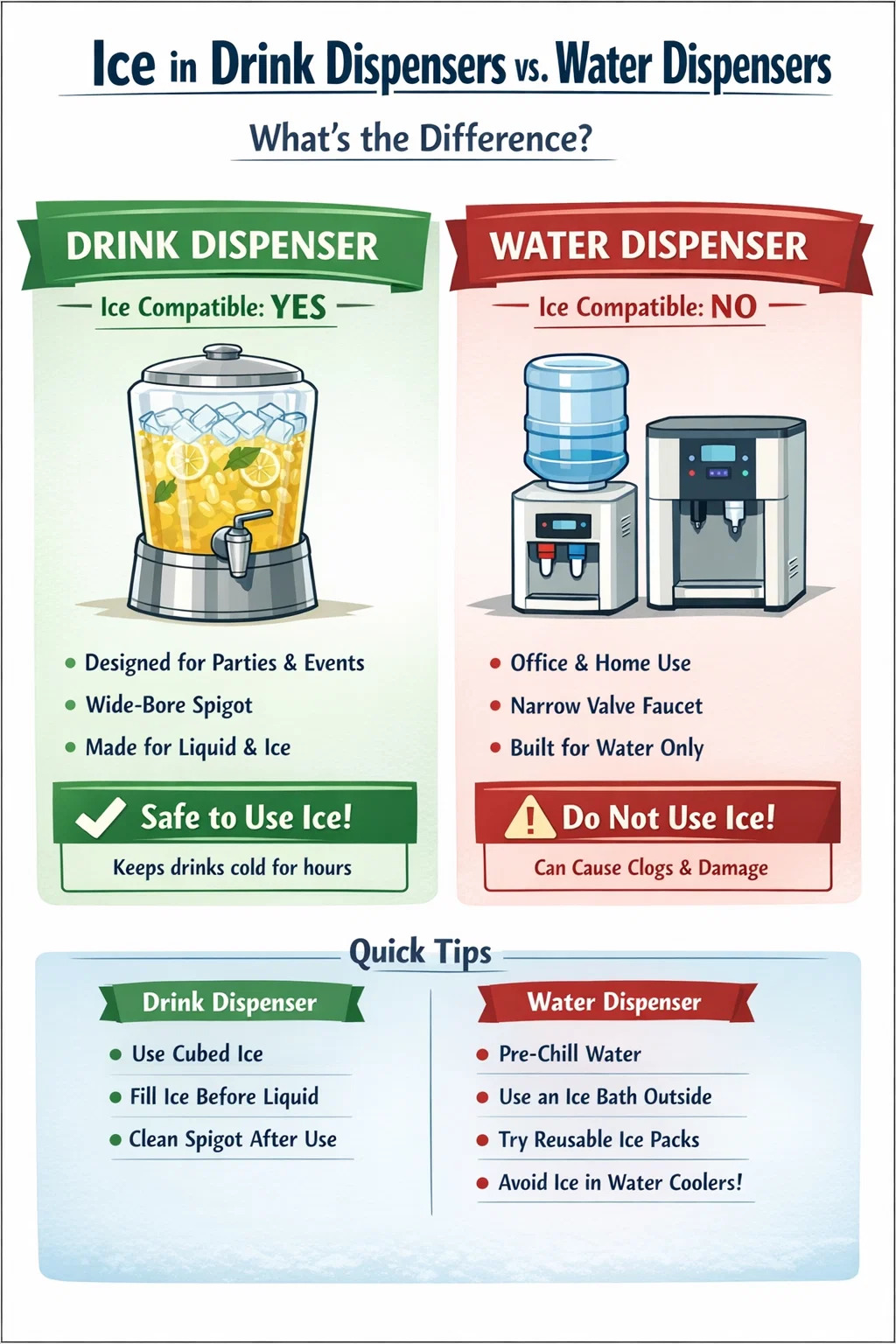 Aceste două categorii de echipamente sunt adesea confundate, dar au funcții foarte diferite. Un dozator de băuturi - numit și distribuitor de băuturi sau distribuitor de suc - este de obicei un recipient mare cu un robinet, folosit la bufete, petreceri sau evenimente de catering pentru a servi limonadă rece, ceai cu gheață, suc sau apă infuzată. Acestea sunt concepute pentru a reține atât lichidul, cât și gheața simultan.