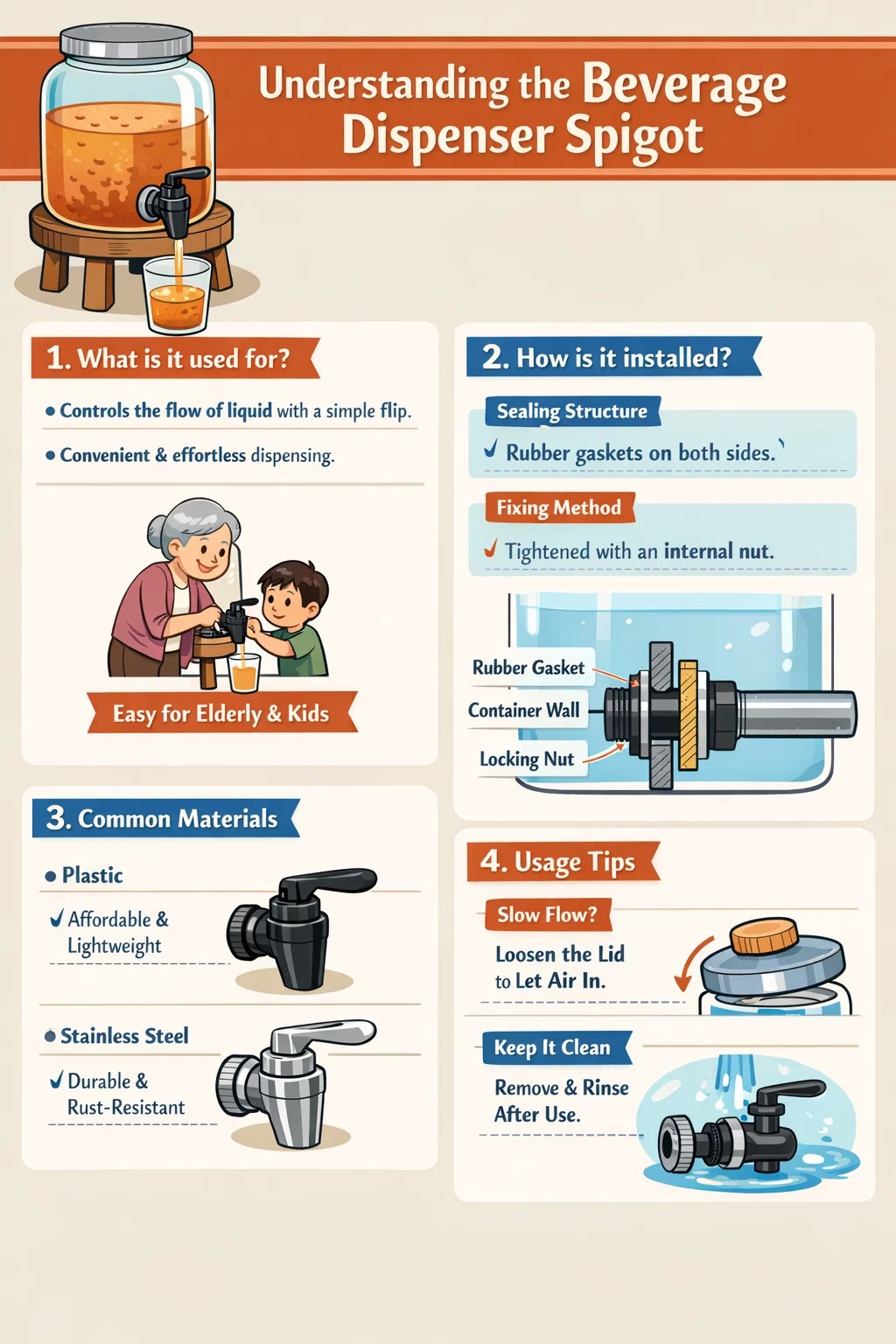 Metoda de fixare: O piuliță mare în interior blochează întregul dozator de băuturi pe recipient, asigurându-se că sucul sau apa din interior nu se scurg prin goluri.